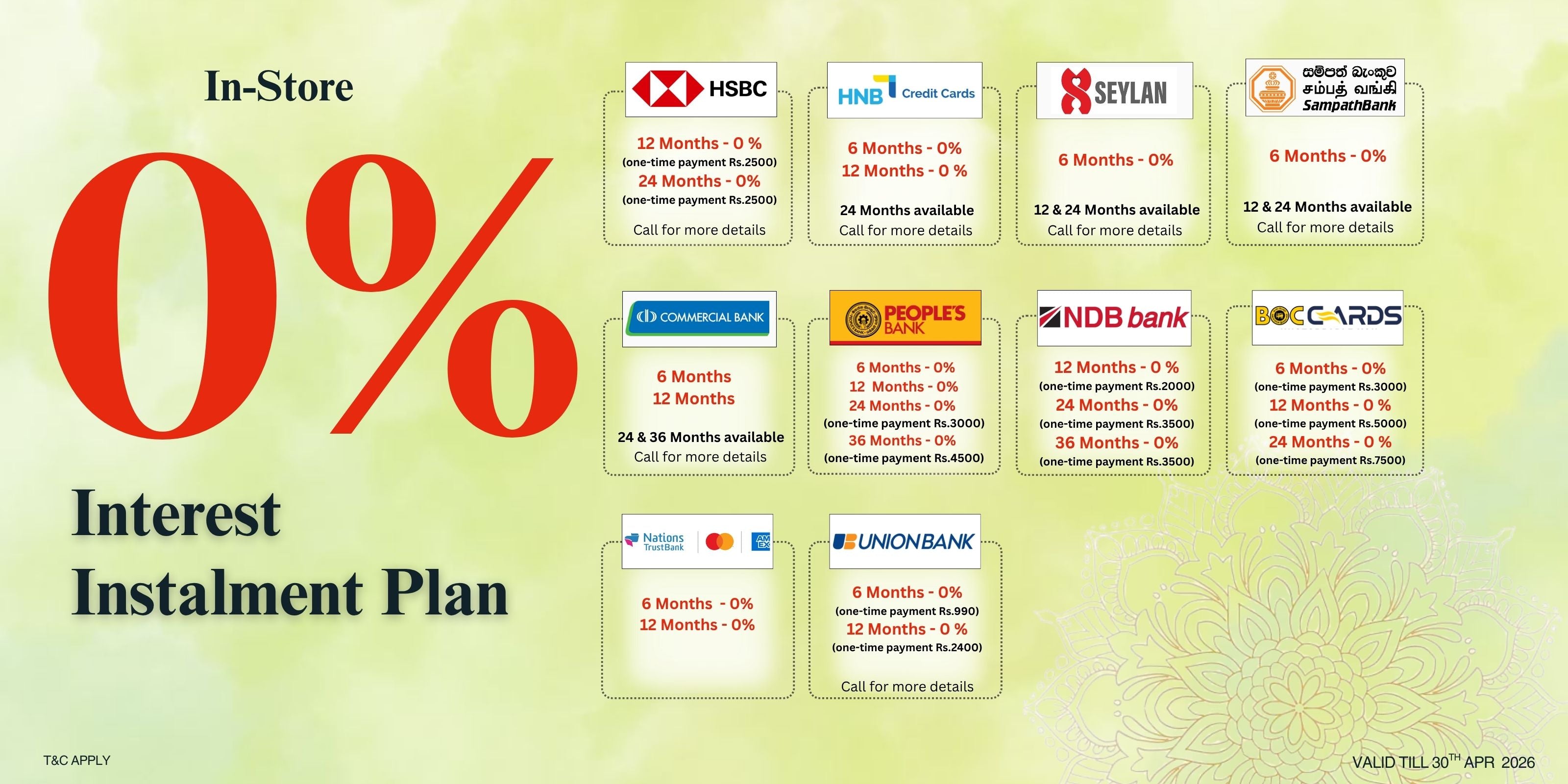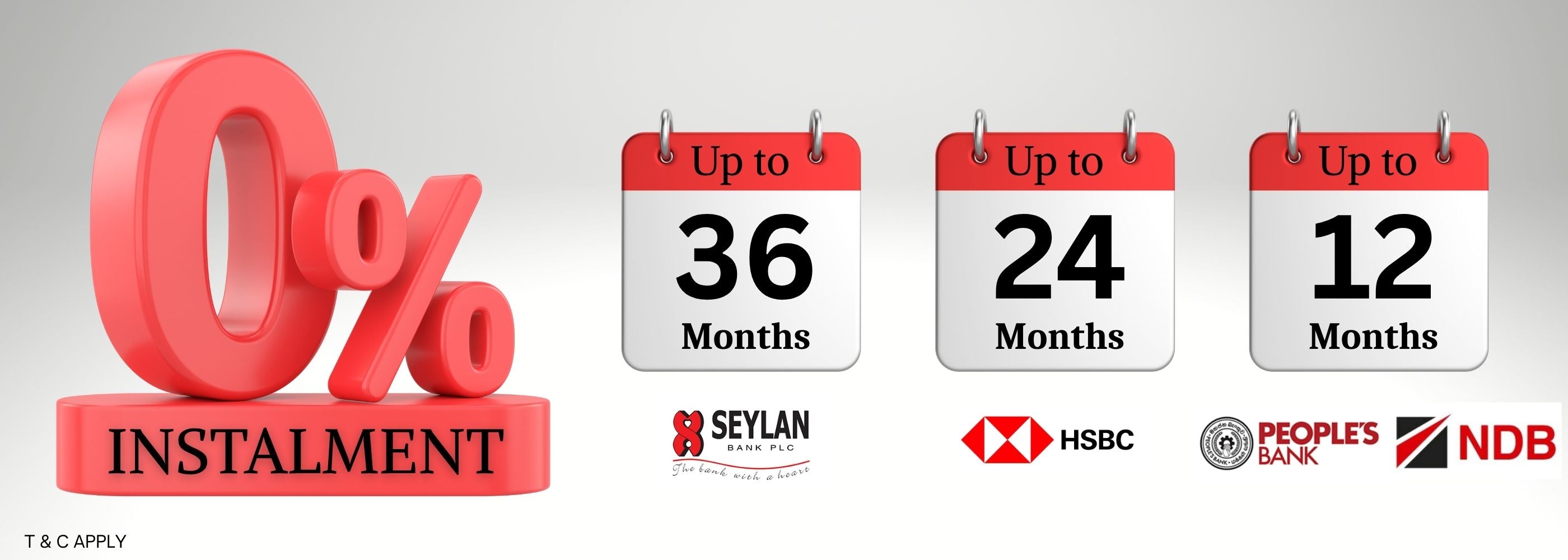 We offer 6-month zero-interest plans for HNB, Seylan, and Sampath credit cards (handling and card fees apply).